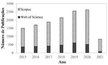 ![]() Figura 4. Número de publicações disponíveis pela base de dados Scopus e Web of Science para a busca de biomarcadores baseados em uma abordagem metabolômica de 2015 a 2021 ( 14/04/2021). Palavras-chaves utilizadas: "metabolomics", "biomarkers" e "applications" (nessa ordem)