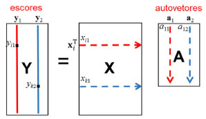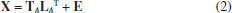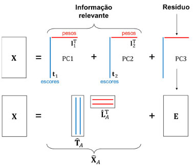![]() Esquema 1. Representação esquemática da decomposição da matriz X (I×3) da expressão 1 em duas componentes principais e a matriz de resíduos