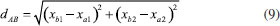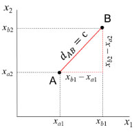 ![]() Figura 3. Distância Euclidiana entre os pontos A com coordenadas (xa1, xa2) e B (xb1, xb2) no espaço bidimensional