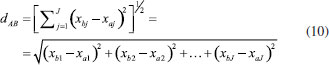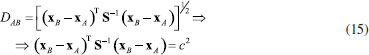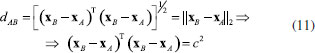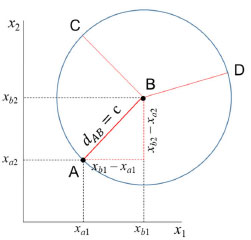 Generalizando para o espaço multidimensional RJ em que xaj e xbj são os valores numéricos da j-ésima coordenada de A e B, respectivamente, a distância é dada pela expressão 10. ![]() A distância Euclideana também pode ser escrita na forma de produto interno de acordo com a expressão 11 ![]() em que xA e xB são dois vetores (J×1) e c é o raio de uma hiperesfera no espaço de dimensão J ou um círculo no espaço bidimensional. Todos os objetos que se encontram no círculo de raio igual a c da Figura 4 são equidistantes de B.