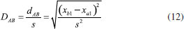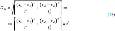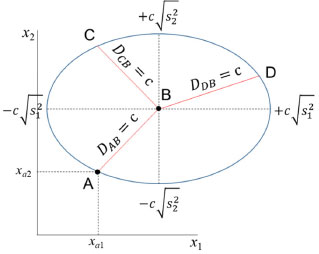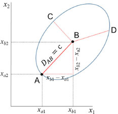 A distância Euclideana não é adequada em muitas análises estatísticas uma vez que ela varia com a mudança de escala. Em várias situações é desejável ponderar as variáveis que possuem variâncias distintas, como no caso do exemplo do chá chinês em que as variáveis foram autoescaladas. A distância de Mahalanobis, DAB é uma distância estatística ou generalizada que foi introduzida pelo matemático indiano Prasanta Mahalanobis em 1936.13 Ela tem em conta a variância de cada variável e também a associação entre elas. Para uma única variável x1, DAB é a distância Euclideana usual ponderada pelo desvio padrão (expressão 12). ![]() No caso de duas variáveis, x1 e x2, com variâncias distintas é razoável ponderar com maior peso a variável com menor dispersão e vice-versa, dividindo ambas pelo seu desvio padrão (expressão 13). ![]() Esse procedimento equivale a autoescalar os dados, fazendo com que as variáveis tenham pesos semelhantes na análise de dados multivariados. Na expressão 13, não foi considerada a correlação entre as variáveis (r12 = 0), i.e., as variáveis são independentes e a matriz de correlação é diagonal. Ao invés de um círculo, a figura formada pelos pontos que estão a uma distância c de Mahalanobis ao ponto B é uma elipse, como exemplificado na Figura 5.