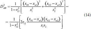 Quando a variabilidade para variáveis distintas é diferente e ao mesmo tempo elas estão correlacionadas com um coeficiente de correlação de Pearson igual a r12, a distância de Mahalanobis é acrescida de mais um termo (expressão 14). ![]() Assim como a distância Euclidiana (expressão 11), a distância de Mahalanobis também é descrita na forma de um produto interno de vetores como mostrado na expressão 15 (()-1 indica a inversa de uma matriz). ![]() Nessa expressão, S-1 é a inversa da matriz de variância-covariância já definida anteriormente (expressão 4). De maneira semelhante ao caso anterior, os objetos que estão equidistantes de B segundo a distância de Mahalanobis com correlação também formam uma elipse, todavia com os eixos rotacionados (Figura 6).