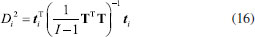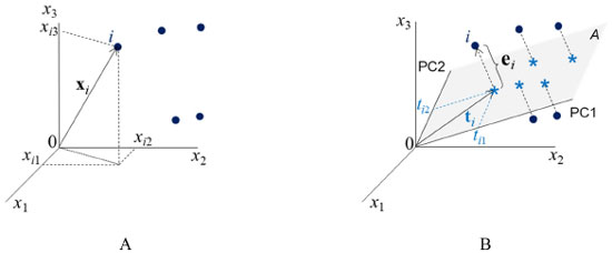 ![]() Figura 1. A) Coordenadas (xi1, xi2, xi3) da amostra i no espaço tridimensional. B) Representação gráfica da projeção dessa mesma amostra no subespaço A gerado pelas duas componentes principais, PC1 e PC2. ti é o vetor de escores definido no plano das PC; ti1 e ti2 são as coordenadas (os escores) de i nesse plano e ei é o vetor de resíduos, ortogonal ao plano A