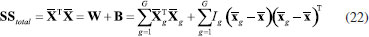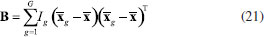 ANÁLISE DE VARIÁVEIS CANÔNICAS DE FISHER, CVA A análise de variáveis canônicas de Fisher, CVA (Canonical Variate Analysis), foi proposta pelo estatístico e biólogo inglês Ronald Fisher em 1936.14 A ideia de Fisher foi transformar as observações multivariadas de diferentes grupos de amostras, representadas na matriz X, definindo novas variáveis designadas de variáveis canônicas de tal modo que a separação entre os grupos fosse maximizada. Deve-se salientar que a atribuição das amostras a diferentes grupos torna o método supervisionado. Tal como no método PCA, essa é uma técnica exploratória de projeção e que permite a redução da dimensionalidade de dados. Ela também usa as informações contidas na matriz X de dados sem assumir nenhuma forma paramétrica para a distribuição das populações ou dos grupos envolvidos. As variáveis canônicas são ordenadas em termos da sua importância, que neste caso não é a variância explicada (Figura 7A), mas a separação em grupos previamente definidos (Figura 7B). As variáveis canônicas mais importantes são usadas para obter uma representação gráfica dos objetos. Em geral, duas ou três dimensões são suficientes para se ter uma boa discriminação visual. Dois fatores são determinantes na separação dos grupos: 1) a distância entre eles e 2) o quão compacto eles são. Para contemplar esses dois fatores, Fisher se baseou na matriz da soma total de quadrados e produtos cruzados, SStotal, que será definida a seguir. Essa matriz descreve a dispersão global dos dados e pode ser particionada, de modo semelhante à análise de variância, na soma de duas matrizes, sendo que uma delas descreve a dispersão dentro dos grupos e a outra, a distância entre os grupos. As variáveis canônicas são derivadas dessas duas matrizes, como sendo as melhores combinações das variáveis originais que maximizam a razão da distância entre os grupos e a variância dentro dos grupos. Do ponto de vista matemático considera-se que X é uma matriz de dados de dimensões (I×J) em que os I objetos estão distribuídos em G grupos de diferentes populações e designados como g1, g2, ..., gG. O grupo 1 é constituído de I1 objetos pertencentes à população g1, o grupo 2 contém os I2 objetos que pertencem ao grupo g2 e assim por diante tal que I1+ I2+ ... + IG = I. A matriz da soma total de quadrados e produtos, SStotal, que descreve a variância global dos dados, está definida na expressão 19 ![]() em que ![]() Nessa expressão, o vetor A soma de quadrados e produtos entre os grupos é representada pela matriz B que está definida na expressão 21. ![]() A matriz B fornece uma medida da distância entre os grupos, que é dada pela distância da média de cada grupo à média global. Uma característica importante dessa matriz é que ela é de posto (G - 1), independente do número de variáveis e, como consequência, somente (G - 1) variáreis canônicas serão diferentes de zero. Uma vez que as matrizes W e B são conhecidas, a soma total de quadrados e produtos, SStotal, pode ser escrita como uma somatória de todos os grupos como indicado na expressão 22. ![]() Segundo Fisher, a melhor descrição dos dados é aquela derivada da razão entre o "quadrado da distância entre as médias e a variância dentro dos grupos". O objetivo é encontrar a direção que maximiza a separação entre os grupos e isso equivale a encontrar a direção no espaço multivariado para a qual a diferença entre as médias dos grupos é a maior possível, comparada à variabilidade dentro dos grupos. É natural então propor que a razão da variabilidade "entre" versus a variabilidade "dentro" dos grupos seja maximizada. Esse é um método de análise exploratória que, de modo muito semelhante ao das componentes principais, define combinações lineares ótimas das variáveis originais. Algebricamente, procuramos uma transformação linear que maximize o produto W-1B, de modo semelhante à expressão 5, sob a condição de que a inversa de W existe. ![]() Resolvendo a equação de autovalores, são encontrados os autovetores a e os respectivos escalares, λ, que são os autovalores. Esses novos eixos são designados vetores canônicos ou variáveis canônicas, CV. As primeiras variáveis canônicas são úteis para condensar a diferença entre os grupos. Uma vez que os vetores canônicos foram determinados, as coordenadas y de todos os objetos no novo sistema de eixos, designadas como "escores canônicos", devem ser calculadas conforme o Esquema 2, que é uma transformação linear onde se projeta cada amostra nas variáveis canônicas. A relação entre os diferentes grupos pode ser visualizada por meio dos gráficos de escores canônicos, em dimensões bem menores. Já foi comentado que CVA é uma técnica supervisionada, mas não de classificação, pois pela própria concepção do método não existe uma regra de classificação.