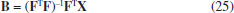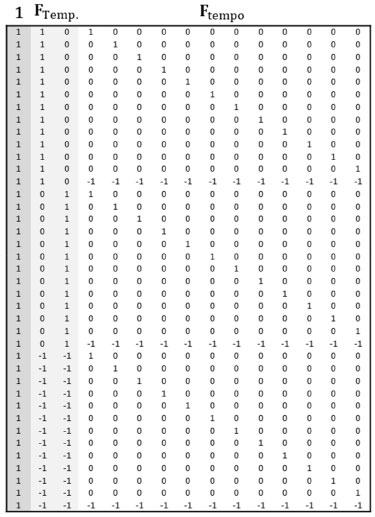 A matriz de dados X tem dimensões (39×12), sendo (13×12) para cada temperatura. Nesse exemplo serão considerados esses dois fatores e a interação entre eles. A matriz de planejamento codificada, F = [1 FTemp Ftempo FTemp×tempo], tem dimensões (39×39) sendo que a primeira coluna de "uns" é usada para o cálculo da média e FTemp×tempo é a interação entre os dois fatores. A Figura 14 contém a matriz de planejamento codificada para os dois fatores, [1 FTemp. Ftempo]. Essa forma de planejamento18 é bastante utilizada na indústria e designada como "codificação de soma zero" (sum coding) quando se impõe a restrição de que a soma de cada coluna deve ser zero. Cada linha da matriz codifica os níveis dos fatores (13 linhas para cada uma das temperaturas) e cada fator com n níveis é codificado com (n - 1) colunas (duas colunas para o fator temperatura e 12 para o fator tempo). Os primeiros (n - 1) níveis são codificados com zeros e uns e o último nível é codificado com -1. Por exemplo, os níveis da temperatura são codificados como [1 0], [0 1] e [-1 -1] para todos os níveis do fator tempo. A matriz codificada da interação temperatura×tempo (39×24) não está incluída nessa figura, mas pode ser facilmente calculada multiplicando elemento a elemento cada uma das colunas de FTemp pelas colunas de Ftempo.