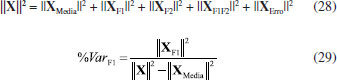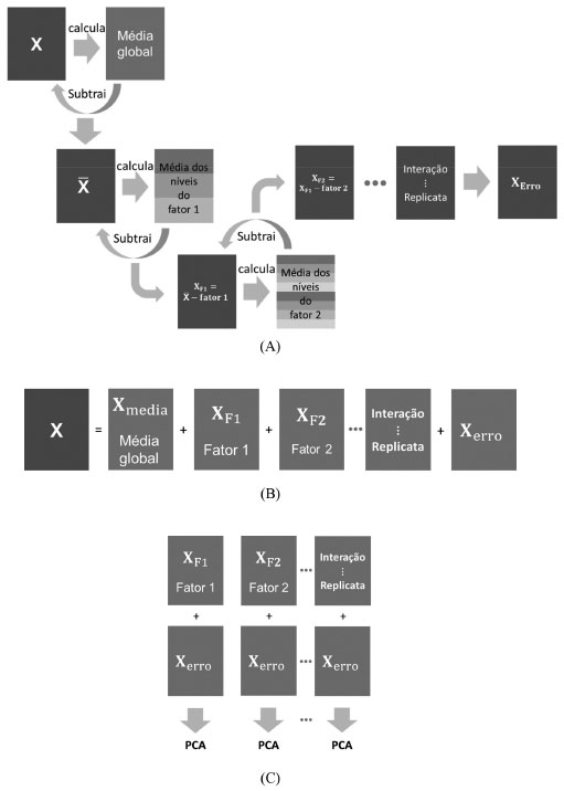 ![]() Esquema 3. Partição da matriz de dados X em matrizes de mesmas dimensões e que descrevem os fatores, interações, replicatas e o erro puro. A) Construção das matrizes de fatores, interação e erro puro. Nesse esquema, o fator F1 tem três níveis e o fator F2 tem oito. B) Resultado da partição sequencial de X em que a soma de todas as contribuições é igual à matriz original. C) A matriz de erros residuais (Xerro do esquema 3B) é adicionada às contribuições de X para a aplicação da análise de componentes principais