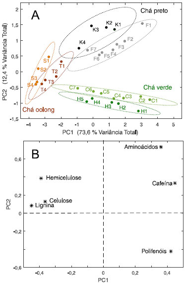 ![]() Figura 2. Gráfico de escores (A) e de pesos (B) de PC1×PC2 das três categorias de chá chinês estudadas sendo que K e F são duas variedades de chá preto, C e H as variedades de chá verde e S e T são as duas variedades de chá oolong. Os índices nos rótulos das amostras indicam a qualidade do chá. O índice 1 foi dado ao chá de melhor qualidade de uma dada variedade