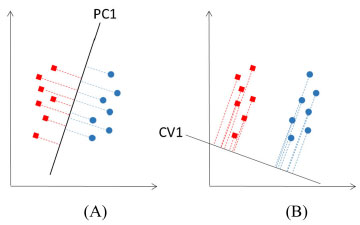 ![]() Figura 7. Dois grupos de objetos de diferentes populações. (A) Escores dos objetos na primeira componente principal (PC1) mostrando que essa direção não separa os dois grupos. (B) projeção dos objetos na primeira variável canônica (CV1), a reta que melhor discrimina os dois grupos