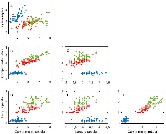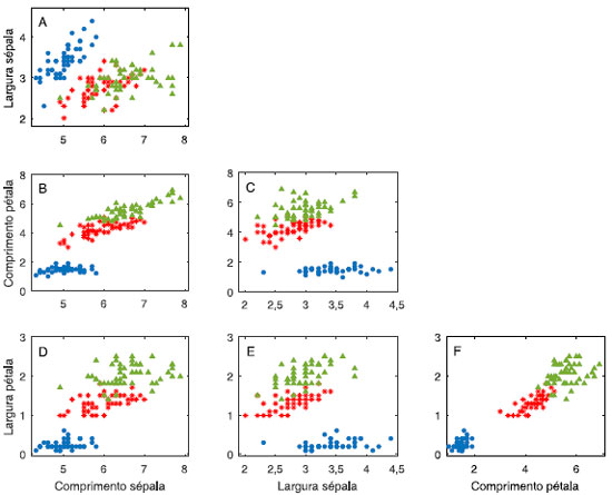 ![]() Figura 8. Gráficos bivariados das medidas realizadas nas flores de íris em centímetros. Íris setosa (●); Íris versicolor (*) e Íris virgínica (▲)