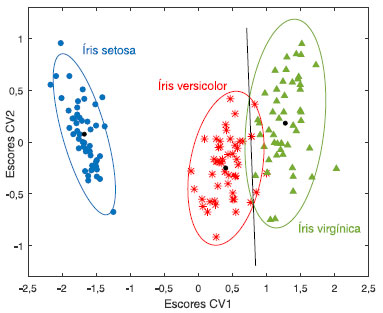 ![]() Figura 9. Gráfico dos scores canônicos de CV1 versus CV2 das três espécies de flores. Os dados da matriz X(150×4) foram autoescalados. Os pontos pretos indicam o centroide de cada grupo. As elipses ao redor das amostras foram traçadas com 95% de confiança