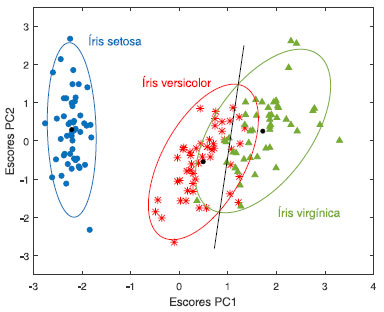 Apenas a título de visualização, assumiu-se que cada grupo apresenta uma distribuição normal para traçar as elipses no nível de confiança α = 0,05 e cuja origem é o centroide da respectiva espécie de flor. A reta que passa pela interseção das duas elipses justapostas (quando as distribuições têm a mesma probabilidade), foi inserida para tornar mais clara a eficiência do método de Fisher. A análise de componentes principais foi aplicada a esse mesmo conjunto de dados autoescalados com a finalidade de comparar os dois métodos e o gráfico de escores obtido para as duas primeiras PC se encontra na Figura 10. De modo semelhante à análise canônica assumiu-se que os dados seguem uma distribuição normal e as elipses foram traçadas com 95% de confiança para comparar os resultados com aqueles da Figura 9.