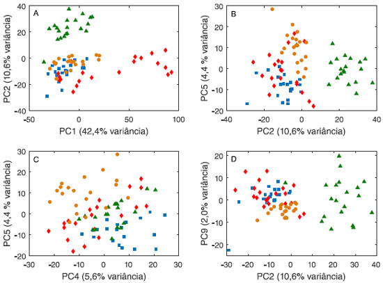 ![]() Figura 11. Gráficos de escores da análise de componentes principais dos compostos voléteis de quatro espécies de fungos: Alternaria alternata (■), Colletotrichum gloeosporioides (●), Fusarium solani (♦) e Lasiodiplodia theobromae (▲). As amostras foram normalizadas pela norma 1 e os dados foram autoescalados