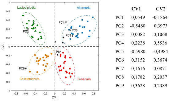 Ao fazer a análise de componentes principais, constatou-se que a partir de 9PC (que descrevem 82,5% da informação dos dados originais) não havia nenhuma tendência de separação das espécies de fungo. Selecionou-se então 9 PC e a análise canônica de Fisher foi aplicada à matriz de escores T9 (80 × 9). Como são quatro espécies de fungos, três variáveis canônicas serão diferentes de zero, i.e., a melhor separação entre os grupos ocorre com 3 CV. A Figura 12 apresenta o gráfico de escores das duas primeiras variáveis canônicas e a composição (os pesos) de cada uma delas. Espera-se que as componentes principais que mais contribuam para a discriminação das espécies sejam aquelas com maiores pesos em CV1 e CV2: PC2, com pesos negativo em CV1 e positivo em CV2, é importante para a discriminação da espécie de fungo Lasiodiplodia; PC4, PC6 e/ou PC9 (com pesos positivos em CV1 e CV2) contribuem para a discriminação da espécie Alternaria enquanto que CV5 (pesos negativos em CV1 e CV2) é importante para a discriminação da espécie Colletotrichum. Quanto à espécie Fusarium, espera-se que PC1 com pesos positivo CV1 e negativo em CV2, tenha uma contribuição na discriminação dessa espécie.