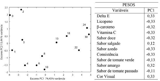 As matrizes B (39×12) dos coeficientes, de resíduos XErro e dos fatores e interação FTemp., Ftempo e FTemp×tempo foram calculadas usando as expressões 25, 26 e 27, respectivamente. Foi feita a análise ANOVA e as variâncias percentuais explicadas pelos fatores temperatura e tempo, interação e resíduo foram calculadas usando a expressão 29 e são, respectivamente, 44,17%, 31,05%, 24,78% e < 0,001% (a variância percentual do erro é praticamente nula). Os dados foram escalados pelo desvio-padrão uma vez que há variáveis com diferentes unidades. Os resíduos foram incorporados a cada fator e interação (Esquema 3C) e a análise de componentes principais foi aplicada separadamente às matrizes resultantes. O primeiro fator investigado foi o tempo. O estudo foi conduzido por 30 meses e foram feitas 13 avaliações nos concentrados de tomate acondicionados nas três temperaturas durante esse período. O gráfico de escores de PC1 × PC2 e os pesos de PC1 estão na Figura 15. Os 13 níveis do fator tempo estão bem discriminados ao longo de PC1 (74,45% da variância), indicando que esse fator é significativo comparado ao erro residual. Para cada nível há três medidas correspondentes às três temperaturas de estocagem. Os pesos descrevem a tendência de degradação do produto ao longo do tempo. Os teores de carotenoides e vitamina C, os sabores doce e azedo, bem como a consistência são elevados no período inicial (pesos negativos), quando os escores são altamente negativos em PC1. Concomitantemente, as cores visual e instrumental (Delta E), e o sabor amargo são menos intensos. À medida que o tempo passa, o produto é gradativamente degradado e ao final (escores positivos em PC1), os carotenoides e a vitamina C apresentam níveis baixos. Além disso, a consistência do concentrado e os sabores doce e azedo diminuíram, o concentrado se tornou mais escuro, mais amargo e ligeiramente salgado.