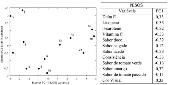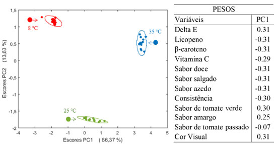 A ampliação dos escores e as elipses traçadas no nível de 95% de confiança foram incluídas para que se possa visualizar a distribuição das amostras. A variação nos escores das medidas realizadas em amostras mantidas na câmara fria (negativos em PC1) é menor uma vez que, excetuando uma amostra que se encontra fora da elipse, todas as outras formam um grupo compacto, indicando que a degradação do produto foi reduzida nessa temperatura. Já a 25 °C bem como a 35 °C as elipses de confiança são maiores e as amostras se encontram dispersas dentro das mesmas confirmando a tendência de degradação do produto. Os pesos indicam que amostras acondicionadas a 8 °C por 30 meses (com escores negativos) mantém altos teores de carotenoides, vitamina C, os sabores (excetuando os sabores amargo e de tomate verde) e as cores instrumental e visual menos intensas. Já as amostras acondicionadas em 35 °C apresentam escores positivos causados pelo decréscimo na concentração de carotenoides e vitamina C, bem como nos sabores doce, azedo, salgado e na consistência. Concomitantemente, há um acréscimo na cor e nos sabores amargo e de tomate verde. Observa-se que o produto estocado a 25 °C, com escores próximos de zero em PC1, sofre degradação menos drástica ao longo dos 30 meses. Comparando os dois fatores tempo e temperatura, observa-se que o sabor de tomate passado tem pesos próximos de zero e, portanto, manteve-se ao longo do tempo e não sofreu influência das temperaturas de estocagem. O sabor salgado e de tomate verde que praticamente não contribuíram com o fator tempo, são mais sensíveis ao efeito da temperatura. A interação temperatura × tempo também foi analisada. De acordo com o planejamento proposto na Figura 14, a interação ocorre entre os tempos finais (iniciais) das amostras acondicionadas a 8 °C e aquelas dos tempos iniciais (finais) acondicionadas a 35 °C. Além disso, entre as amostras finais e iniciais estocadas a 25 °C. A Figura 17 apresenta o gráfico de escores onde é visível que não existe uma discriminação dos grupos e conclui-se que a interação temperatura × tempo não é significativa.