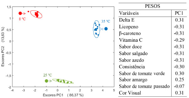 Para o fator temperatura, os escores obtidos estão na Figura 16 juntamente com os pesos em PC1 uma vez que essa é a componente que descreve a máxima variância desse fator (86,37%). Os três níveis de temperatura (do mercado consumidor a 25 °C; abaixo e acima dessa temperatura, a 8 °C e 35 °C, respectivamente) estão bem separados ao longo de PC1 mostrando que o fator temperatura também é significativo comparado ao erro residual.