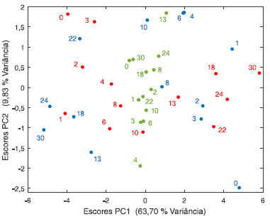 ![]() Figura 17. Resultados dos escores de PC1×PC2 obtidos da ANOVA-PCA para o fator de interação temperatura × tempo. Os índices indicam o tempo em que as análises experimentais e sensoriais foram realizadas. a 8°C (●), 25°C, (●) e 35 °C (●)