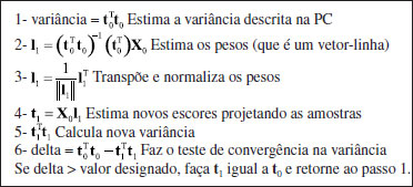 Generalizando para J variáveis, A essa altura torna-se claro ao leitor que, a análise de componentes principais é baseada exclusivamente nas informações contidas na matriz de dados, sem assumir nenhuma forma paramétrica para a distribuição da população. Os métodos mais comuns para o cálculo dos escores e os pesos utilizam: 1) o algoritmo NIPALS (Non Linear Iterative Partial Least-Squares); 2) a diagonalização da matriz de variância-covariância ou; 3) a decomposição por valores singulares, SVD. O algoritmo NIPALS11 foi o primeiro método proposto para esse fim.7 Ele calcula as componentes principais uma a uma. O processo é iterativo e inicia-se com a matriz de dados devidamente pré-processada, X0. Como o objetivo no caso é definir vetores que descrevam a máxima variância dos dados, é natural selecionar a coluna de X0 que tenha a maior variância como escore inicial, t0. O quadro a seguir descreve a sequência de passos da primeira iteração.