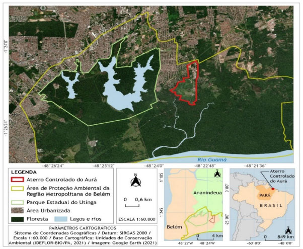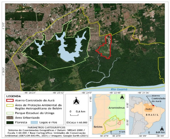 PARTE EXPERIMENTAL Área de estudo Do ponto de vista geológico, a cidade de Belém e seu entorno estão localizados sobre uma unidade basal denominada de Grupo Barreiras, sotoposta às Coberturas Detrito-Lateríticas Neo-Pleistocênicas e às Aluviões Holocênicas. O Grupo Barreiras é composto de arenitos, siltitos, argilitos e conglomerados de cores variadas, com níveis concrecionários e caulínicos.14,15 Aterro do Aurá, área destinada à deposição dos resíduos sólidos na RMB, está localizado nos limites do município de Ananindeua e Belém a 19 km do centro da cidade de Belém, em uma área conhecida como Santana do Aurá, bairro de Águas Lindas. Ocupando aproximadamente 130 ha, localizada dentro da Área de Proteção Ambiental (APA) de Belém situa-se a margem esquerda do Rio Aurá, que por sua vez é afluente do Rio Guamá, onde desembocam os igarapés Tucunduba e Água Preta. A oeste da área do aterro, situados a aproximadamente 1.400 metros de distância, localizam-se os mananciais Bolonha e Água Preta, responsáveis pelo abastecimento de água da RMB16 (Figura 1).