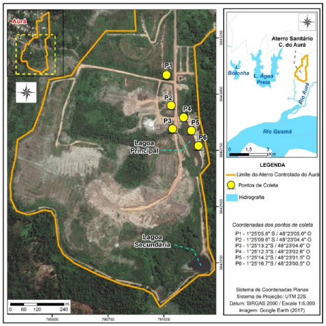 Segundo a Secretaria de Saneamento de Belém (SESAN),17 o aterro recebia no ano de 2014 em torno de 1.900 t/dia de resíduos sólidos urbanos provenientes da RMB, composta pelos municípios de Ananindeua, Marituba, Benevides, Santa Bárbara e Santa Isabel, com um território de 50.582,30 ha sendo a porção continental correspondente a 17.378,63 ha e a porção insular composta por nove ilhas que correspondem a 33.203,67 ha.17 Pontos de coletas A coleta das amostras destinadas ao monitoramento no aterro controlado do Aurá ocorreu no período de maio de 2015 a março de 2016 através de quatro amostragens realizadas nos meses de maio, agosto e dezembro de 2015 e março de 2016, abrangendo o período mais chuvoso que vai de dezembro a maio e o menos chuvoso de junho a novembro. Foram selecionados seis pontos para coleta das amostras de chorume, distribuídos entre as bases das células de deposição de resíduos sólidos que estão desativadas e a lagoa principal de deposição do líquido percolado no aterro, conforme ilustra a Figura 2.