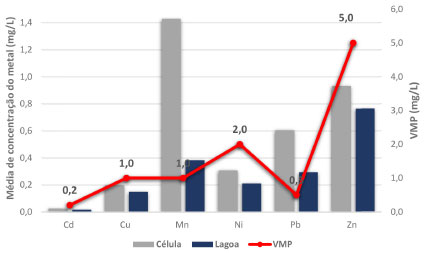 ![]() Figura 3. Distribuição das concentrações de Cd, Cu, Mn, Ni, Pb e Zn em comparação com o Valor Máximo Permitido -VMP (CONAMA n. 430/2011)