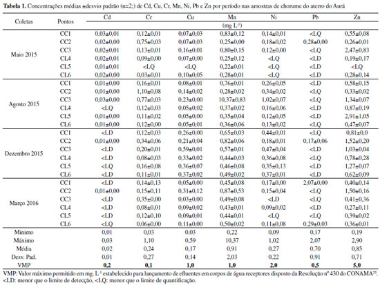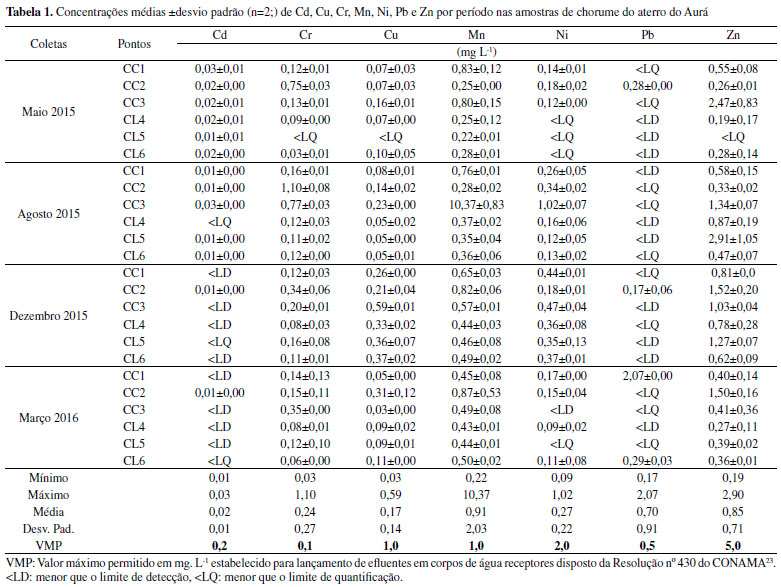 RESULTADOS E DISCUSSÃO O pH nos pontos amostrados apresentaram valores alcalinos com mínimo e máximo de 8,2 a 8,6 para as amostras de chorume. Tais valores apresentaram-se na mesma faixa de pH (8,0 - 8,5) determinados por Riguetti et al.,2 em amostras de chorume do Aterro Sanitário em Dourados, MS, semelhantes ao pH de 8,4 determinado por Morais e Zamora4 no Aterro Sanitário de Caximba, Curitiba, PR e dentro da faixa de pH (5,7 - 8,6) encontrada por Souto,18 para aterros sanitários. Os valores básicos de pH no chorume indicam a predominância de resíduos em estado avançado de decomposição, a coloração marrom escuro no chorume sugere a formação de substâncias húmicas e fase metanogênica de estabilização em que predominam microrganismos estritamente anaeróbios, denominados metanogênicos, que convertem ácido acético e gás hidrogênio em CH4 e CO2. A formação do metano e dos ácidos prossegue simultaneamente, embora a taxa de formação dos ácidos seja reduzida consideravelmente. O pH do chorume nessa fase ascenderá a valores na faixa de 6,8 a 8,0 e o valor da condutividade do chorume reduz. Menos constituintes inorgânicos permanecerão dissolvidos, tendo como consequência a redução da concentração de metais potencialmente tóxicos no chorume.19,20 O pH exerce forte influência na dinâmica dos íons metálicos catiônicos (Cu2+, Zn2+, Ni2+, Mn2+, Fe2+, Cr2+, Co2+, Pb2+ e Cd2+). Ambientes em condições de pH acima de seis favorecem a dissociação de H+de grupos OH da matéria orgânica e dos óxidos de Fe e Al, aumentando a adsorção dos metais e posterior precipitação, reduzindo a sua biodisponibilidade.21 Para verificar a influência do índice pluviométrico no pH do chorume e na concentração dos metais, as coletas foram realizadas em épocas com diferentes índices: maio/2015 (554 mm), agosto/2015 (223,5 mm), dezembro/2015 (225 mm) e março/2016 (746 mm). Os resultados indicaram que nas coletas realizadas no período menos chuvoso, meses de agosto a dezembro, ocorre pequeno aumento nas concentrações dos metais, revelando uma discreta influência entre os períodos, provavelmente devido às peculiaridades da região que é a de não apresentar um período característico de inverno ou de verão, tendo, portanto, um período com maior intensidade de chuva, que é denominado período mais chuvoso e outro denominado período menos chuvoso. Os resultados analíticos dos metais Cd, Cr, Cu, Mn, Ni, Pb e Zn determinados nas amostras de chorume do aterro do Aurá com valores médios e desvio-padrão das concentrações para cada ponto e época de coleta podem ser visualizados na Tabela 1. Os resultados obtidos foram analisados considerando os valores dispostos na Resolução nº 430/2011 do CONAMA,13 que dispõe sobre condições, parâmetros, padrões e diretrizes para gestão do lançamento de efluentes em corpos de água receptores