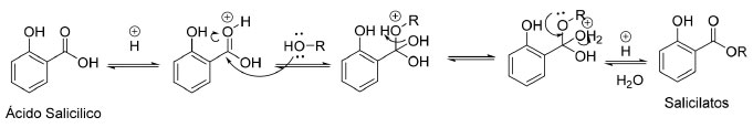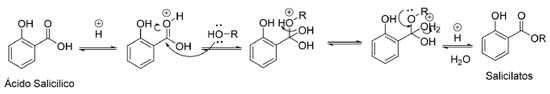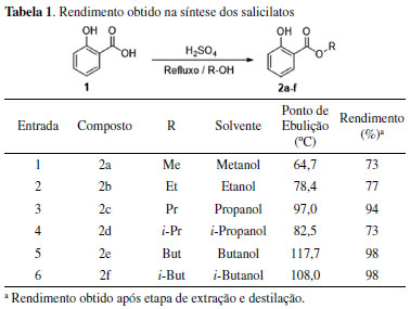 PARTE EXPERIMENTAL Síntese dos salicilatos Em um balão reacional, equipado com condensador de refluxo, adicionou-se 1,38 g de ácido salicílico, ácido sulfúrico concentrado em quantidade estequiométrica e 10 mL do álcool de interesse. O sistema reacional foi mantido sob refluxo por um período de 24 horas. Em seguida, adicionou-se 20 mL de diclorometano e a fase orgânica foi lavada com água e solução saturada de bicarbonato de sódio. A fase orgânica foi seca com sulfato de magnésio anidro e o solvente foi removido a pressão reduzida. Os produtos foram purificados por destilação a vácuo.26 O mecanismo da reação de síntese dos salicilatos está descrito a seguir (Figura 1).