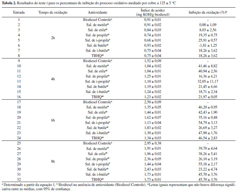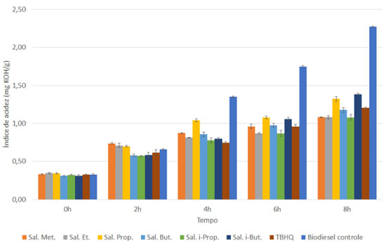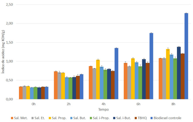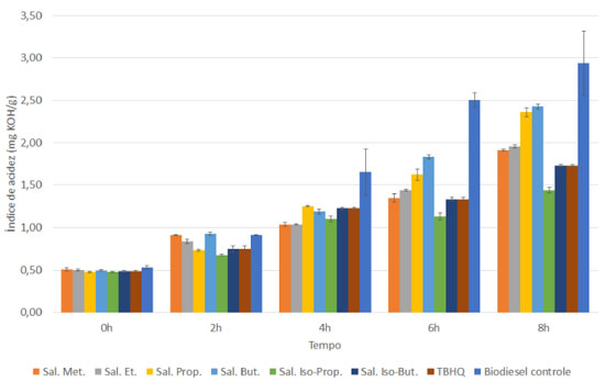 No tempo de 2 horas de oxidação fica evidenciado que o índice de acidez do biodiesel controle dobra o valor comparado ao tempo inicial (0 horas). Esse resultado é acompanhado pelas amostras de biodiesel aditivados com os salicilatos de metila e butila (Figura 2). No entanto, para os salicilatos de etila, propila, isopropila e isobutila, observa-se uma redução no índice de acidez de 8,03%, 19,35%, 25,91% e 18,26%, respectivamente (Tabela 2, Entradas 3, 4, 5 e 7), em relação às amostras de biodiesel sem aditivos. Destaca-se que, no período de 2 horas, o salicilato de isopropila supera o valor de 18,26% obtido para o antioxidante TBHQ (Tabela 2, Entradas 5 e 8). De acordo com a análise estatística, o resultado apresentado pelo salicilato de isopropila é significativamente diferente do valor de acidez obtido para o biodiesel aditivado com TBHQ.