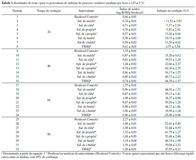No período de 4 horas do teste de oxidação, o índice de acidez do Biodiesel Controle aumentou para 1,54 mg de KOH/g de biodiesel. Nesse mesmo intervalo de tempo, o índice de acidez das amostras contendo os salicilatos permaneceu na faixa de 1,04-1,24 mg de KOH/g de óleo, Figura 2. O teste estatístico demonstra que a acidez do Biodiesel Controle é significativamente diferente das demais amostras. Os percentuais de inibição estão na faixa de 16,36-40,95% (Tabela 2, Entradas 10 a 15), com destaque para os salicilatos de metila, etila e isopropila que superaram a atividade antioxidante do TBHQ (Tabela 2, Entradas 10, 11, 13 e 16). Após 6 horas de oxidação observa-se que os salicilatos de cadeias lineares menores apresentam maior potencial na inibição da oxidação, quando comparados aos salicilatos de cadeias lineares mais longas (Tabela 2, Entradas 18, 19, 20 e 22). Já os salicilatos de cadeia ramificadas apresentaram os maiores percentuais de redução do processo oxidativo, com 54,79% para o salicilato de isopropila e 47,90% para o salicilato de isobutila (Tabela 2, Entradas 21 e 23). Os resultados obtidos nestes dois casos foram superiores aos encontrados para as amostras contendo TBHQ (Tabela 2, Entrada 24). De acordo com o teste estatístico, o resultado apresentado para o salicilato de isopropila foi significativamente diferente do valor observado para o antioxidante TBHQ. Decorrido 8 horas de experimento, o perfil do processo oxidativo foi muito semelhante ao observado em 6 horas de oxidação. Os salicilatos de cadeia linear mais curtas (metila e etila) foram mais efetivos na inibição do processo oxidativo, quando comparado às estruturas de cadeia mais longa (propila e butila). Observa-se um decréscimo da atividade antioxidantes com o aumento da cadeia carbônica (Tabela 2, Entradas 26, 27, 28 e 30). Já os salicilatos de cadeia ramificada apresentam os melhores resultados com índice de acidez de 1,44 mg de KOH/g de biodiesel para o salicilato de isopropila e 1,73 mg de KOH/g de biodiesel para o salicilato de isobutila. Novamente o salicilato de isopropila destacou-se na inibição do processo oxidativo, atingindo o valor de 55,18%, enquanto o TBHQ reduziu a oxidação do biodiesel em 45,70% (Tabela 2, Entradas 29 e 32). Novamente, o teste estatístico demonstra que os resultados são significativamente diferentes entre si. Da mesma forma como foi desenvolvido o teste de oxidação mediado por cobre elementar, os salicilatos foram avaliados na inibição do processo oxidativo do biodiesel mediado por ferro elementar. Durante as duas primeiras horas de oxidação, os valores de acidez das amostras de biodiesel contendo os salicilatos foram muito próximos do valor obtido para o Biodiesel Controle, Figura 3. Conforme a Tabela 3 (Entradas, 2, 3 e 4), percebe-se que os salicilatos de metila, etila e propila não foram capazes de inibir a oxidação mediada por ferro. No entanto, verifica-se que cadeias mais longas e ramificadas contribuem no processo de inibição da oxidação do biodiesel (Tabela 3, Entradas, 5, 6 e 7), fornecendo percentuais de inibição levemente superiores ao TBHQ (Tabela 3, Entrada 8). No entanto, de acordo com a análise estatística, os resultados não são significativamente diferentes.