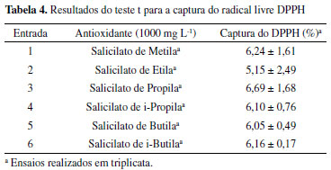 Como pode ser verificado no Figura 3, o efeito protetor dos salicilatos torna-se mais perceptível a partir da quarta hora de oxidação, na qual o biodiesel atinge valores de acidez de 1,35 mg de KOH/g de biodiesel (Tabela 3, Entrada 9). Neste mesmo período de exposição, as amostras de biodiesel acrescidas com os salicilatos apresentaram valores de acidez na faixa de 0,78 a 1,04 mg de KOH/g de óleo (Tabela 3, Entradas 10 - 15), resultados próximos ao obtido para o biodiesel aditivado com TBHQ, 0,74 mg de KOH/g de biodiesel (Tabela 3, Entrada 16). O teste estatístico demonstra que a oxidação do Biodiesel Controle foi significativamente diferente das demais amostras. Analisando o percentual de inibição do processo oxidativo, os biodieseis acrescidos de salicilatos apresentaram valores de acidez na faixa de 22,66 a 42,36% menores do que o biodiesel Biodiesel Controle (Tabela 3, Entradas 10 - 15). Com destaque para o salicilato de isopropila e isobutila, com percentuais de inibição na mesma faixa do TBHQ (Tabela 3, Entradas 13, 15 e 16). Transcorrido o período de 6 horas de oxidação, o Biodiesel Controle apresentou índice de acidez de 1,75 mg de KOH/g de biodiesel, este valor é cerca de 38,27-50,26% superior aos índices de acidez obtidos para os biodieseis aditivados com os salicilatos (Tabela 3, Entradas 17 - 23). Destacam-se os salicilatos de etila e isopropila, com percentuais de redução do processo oxidativo de 50,13 e 50,26%, respectivamente (Tabela 3, Entradas 19 e 21). Cabe ressaltar que os valores obtidos para esses salicilatos foram superiores aos resultados para o antioxidante comercial TBHQ (tabela 3, entrada 24). Ao final do período de 8 horas de oxidação, os biodieseis contendo os salicilatos apresentaram índices de acidez que ficaram na faixa de 1,08-1,39 mg de KOH/g de biodiesel, valores equivalentes a 39,08 52,48% inferiores comparados ao Biodiesel Controle (Tabela 3, entradas 25-31), demonstrando a efetividade dos salicilatos na inibição da oxidação mediada por ferro. Após o período de 8 horas os salicilatos de metila, etila, isopropila e butila (Tabela 3, entradas 26, 27, 29 e 30) apresentaram valores de inibição superiores ao antioxidante comercial TBHQ (Tabela 3, entrada 32). No entanto, a análise estatística demonstra que estes resultados não apresentam diferenças significativas entre si. O índice de acidez é um indicativo do processo oxidativo do biodiesel, a partir da degradação dos hidroperóxidos formados na etapa de propagação da peroxidação. Esse processo pode ser catalisado através da presença de metais de transição, mesmo em pequenas quantidades. Dessa forma, os salicilatos demostraram potencial na inibição da oxidação do biodiesel, através da redução dos índices de acidez com a adição dos salicilatos, comparados ao biodiesel controle e ao TBHQ, principal antioxidante empregado na indústria. Captura do radical DPPH Dois mecanismos são propostos quando um antioxidante reage com o radical DPPH realizando a neutralização ou redução. O primeiro baseia-se na transferência de elétrons, já o segundo mecanismo envolve a transferência de um átomo de hidrogênio. De acordo com a literatura, o principal mecanismo acontece pela transferência de elétrons, o segundo mecanismo é considerado uma via marginal e pode ocorrer de forma reversível.32 Assim, moléculas que atuam na captura do radical DPPH podem ser classificadas como antioxidantes primários.15-17 Baseado no exposto, a atividade na captura do radical DPPH, além de indicar a potencialidade de uma estrutura como um possível antioxidante, possibilita classificá-lo quanto ao mecanismo de ação, ou seja, antioxidantes primários e secundários. Na Tabela 4 são apresentados os percentuais da captura do radical DPPH quando soluções dos salicilatos foram empregadas na concentração de 1000 mg L-1.