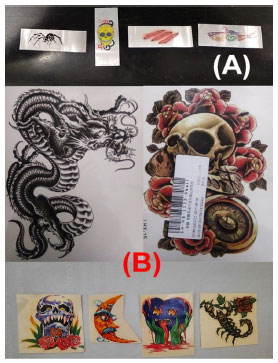 ![]() Figure 1. Examples of the analyzed adhesive tattoos: (A) temporary tattoos present in bubble gum and (B) temporary adhesive tattoos on cards