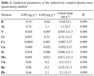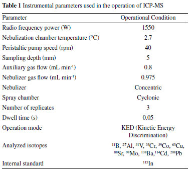 Analyses were performed using the optimized instrumental parameters shown in Table 1. All analytical reference solutions were prepared using concentrations of multi-element standards in a range from 0 to 500 µg L-1, in order to perform the instrument calibration.