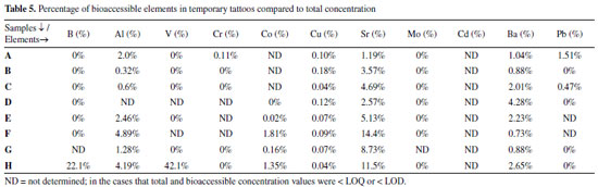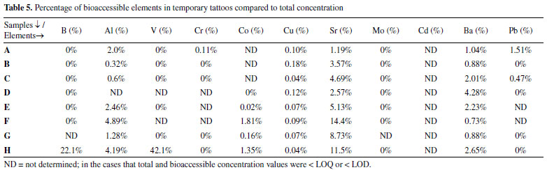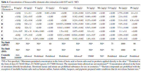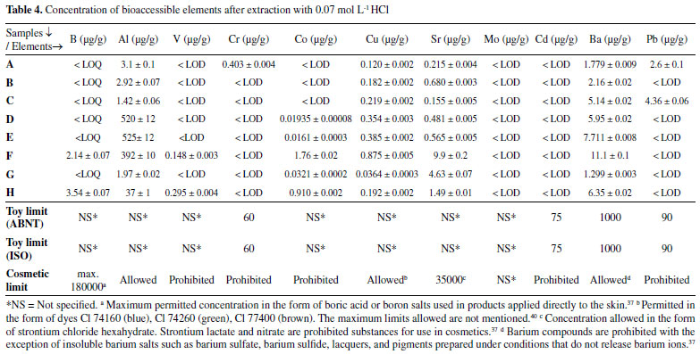 CONCLUSIONS In this study, the levels of bioaccessible elements were evaluated (B, Al, V, Cr, Co, Cu, Sr, Mo, Ba, Cd and Pb) in temporary tattoos used by children and youth/adults. The evaluation was carried out by simply extracting the potentially toxic elements from the tattoos with a 0.07 mol-1 HCl solution and analyzed by ICP - MS as described by the national and international toy's safety standards. The experimental analytical parameters, such as LOD, LOQ and linear range, confirmed the adequate performance of the methodology and enabled the comparison with the limits of the standards. Cd (bioaccessible and total content) and Mo (bioaccessible) were not detected in all analyzed samples (<LOD). On the other hand, bioaccessible barium was obtained in all 8 samples tested whose concentration varied from 2.001 11.116 µg g-1. Chromium was found in one of the tattoo samples used by the child audience, while lead and vanadium were found in two samples, with lead being detected in tattoo samples for children. High concentrations of aluminum were obtained mainly in children's tattoos. Cobalt, a metal known to be allergenic in contact with the skin, was detected in 7 samples. Copper and strontium were found in all tested samples. The concentrations of bioaccessible elements obtained in this study did not exceed the maximum limits established by the Brazilian toy's safety standards. However, bioaccessible species of chromium, lead, barium and cobalt have been detected which are prohibited in cosmetic products applied directly to the skin due to toxic health effects. Thus, it can be concluded that although temporary tattoos are in accordance with toy safety, some toxic elements found in tattoos are in direct contact with the skin of those using the product, especially children. It is then necessary to alert the community and regulatory bodies about the risks involving the use of temporary tattoos due to the unknown composition of the inks. In future works, the identification and determination of the concentration of dyes present in these products may bring more information about the composition of the inks of this type of product.