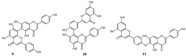 ![]() Figure 4. Agathisflavone (9), amentoflavone (10), and hinokiflavone (11) structures