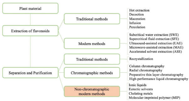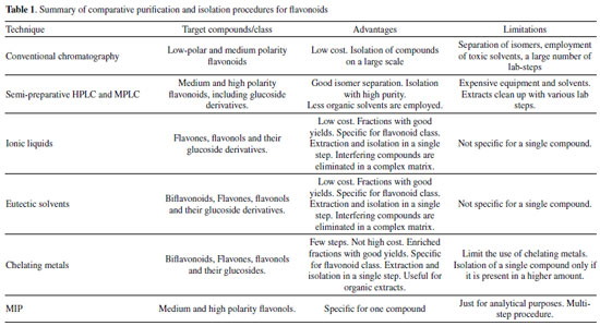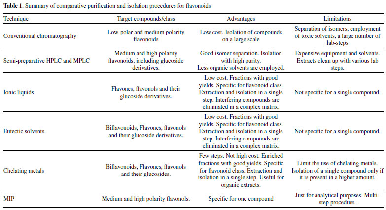 CONCLUDING REMARKS To date, chromatographic methods are the main techniques for flavonoid purifications. Most of them employ high-cost equipment and demand a considerable number of laboratory steps. However, in the last decades, studies dealing with new techniques for the non-chromatographic, greener, and more efficient extraction and purification of flavonoids have been presented (Table 1). Some of them are old, such as the complexation with metals, but some improvements have become specific nowadays. Besides them, ionic liquid and deep eutectic solvents seem to be the more promisor procedures because they afford better yields than the conventional methods. Once they can isolate a single flavonoid or are specific for the class, and enriched fractions of these compounds. However, they are hardly employed for a single isolated flavonoid once the specificity is for all phenolics compounds or a subclass of flavonoid. Specific procedures for single compounds, like MIPs, are also employed for analytical purposes but not for preparative or semi-preparative flavonoid purifications.