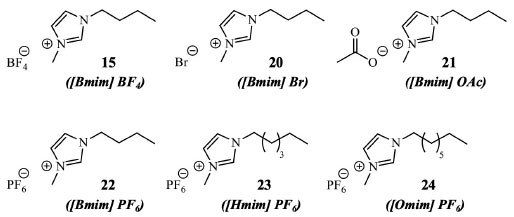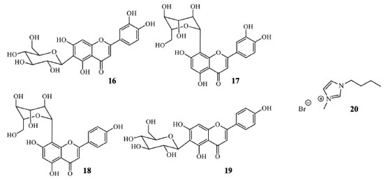 The ionic liquid 1-butyl-3-methylimidazolium bromide ([BMIM]Br, 20) when used in the ultrasound-assisted extraction of flavonoids isoorientin (16), orientin (17), vitexin (18), and isovitexin (19), also demonstrated good capacity of flavonoid extraction. This ionic liquid was selected between 15 different combinations of cations and anions employing leaves of Phyllostachys heterocycla (Figure 7). [BMIM]Br (20) reached the capacity of 4.592 mg flavonoid per gram of leaves. According to that study, the authors conclude that the anion portion interacts with flavonoid phenolic hydrogens, and the cation binds with the flavonoid nucleus. The procedure is simple; after extraction, the mixture containing flavonoids is diluted in deionized water and partitioned with n-butanol. That procedure recuperated 97.87 ± 0.25% of flavonoids and 96.52 ± 0.63% of ionic liquid from the extract.39