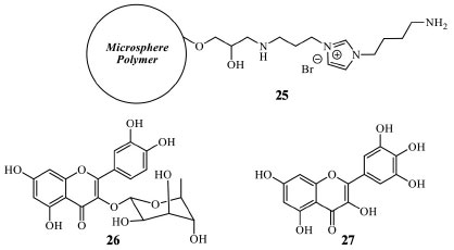 ![]() Figure 9. Polymeric microsphere modified by the ionic liquid (25), quercitrin (26), and myricetin (27) structures