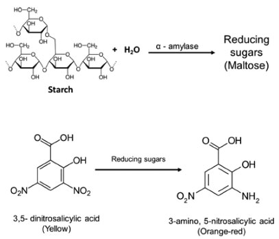 ![]() Scheme 1. Reaction of the α-amylase inhibition assay. First, the reaction is performed in which the starch is reduced and, by the action of α-amylase, reducing sugars are generated. Second, Miller's reaction between DNS and reducing sugars produces ANSA
