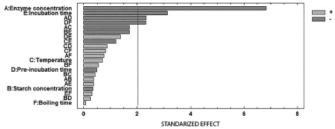 This study optimizes and validates microscale in vitro methods for the assessment of α-amylase inhibition. In the present method of Miller's reaction, the product to be analyzed was obtained by heating it in a boiling water bath. Because it is impossible to perform boiling in a microplate because a significant volume of liquid evaporates and negatively affects the response, the experiment was conducted in the tubes, and the microquantities were transferred to microplates and recorded. Enzyme kinetics and inhibition studies The α-amylase assay was performed using Miller's method, i.e., the DNS method. This method is a redox reaction where DNS (yellow color) is reduced by reducing sugars to 3-amino-5-nitrosalicylic acid (red color) in an alkaline medium. Due to the presence of free carbonyl groups in sugars, they can reduce DNS and are oxidized to carboxyl groups. The reduced 3-amino-5-nitrosalicylic acid is red-brown in color and can be quantified spectrophotometrically with an absorption maximum at 540 nm. The higher is the intensity of color, the higher is the concentration of reducing sugars in the solution. Acarbose, a positive control, was used as an inhibitor for this experiment. It is a reversible, competitive inhibitor. Because acarbose is structurally similar to the substrate (starch), it competes for the active site on the enzyme. When the substrate concentration is increased, the inhibition by the competitive inhibitor is reversed. The degree of inhibition was evaluated in terms of the concentration of the inhibitor that inhibited half of the enzyme activity (IC50). When the enzymatic activity decreases, the formation of the product also decreases; therefore, the intensity of the color is reduced. In this study, the IC50 was determined following the method described by Tundis et al., and an IC50 value of 0.6 µg mL-1 was obtained.26 Statistical optimization Optimization of the α-amylase inhibition assay was performed using fractionalized factorial design (2^6-1). Different parameters, such as enzyme concentration, substrate concentration (starch), preincubation time, incubation time, incubation temperature, and time in the water bath, were evaluated. The Pareto diagram (Figure 1) shows that some factors exhibit a significant effect on the response. The enzyme concentration, incubation time, interaction between enzyme concentration and preincubation time, and the interaction between preincubation and boiling time showed a significant effect on the inhibition percentage. An independent parameter, i.e., enzyme concentration, has a significant effect because as the enzyme concentration increases, the enzyme activity increases up to a certain level and then decreases. However, because the incubation temperature is increased, more reactions between the enzyme and substrate occur. Thus, it is important to optimize these two parameters to obtain a fixed value.