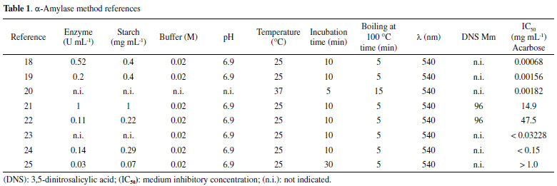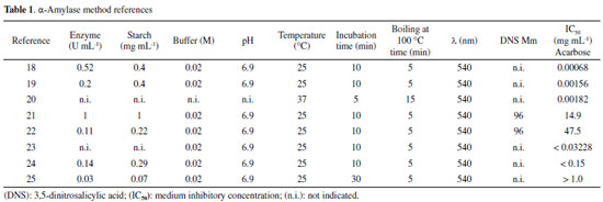 RESULTS AND DISCUSSION Previous studies citing the assays of in vitro antihyperglycemic activity measurements, including detailed procedures and the use of positive controls, were collected and analyzed (Table 1). This evaluation revealed that "minor modifications/changes" in the assay conditions can lead to a significant variation in IC50 values (0.00068 to 47.5 mg mL-1) with acarbose used as a positive control. This discrepancy highlights the reason for not comparing the results obtained by different reports, although they might have used the same method but with different experimental conditions. Comparison of such results will lead to low reliability of these in vitro methods.