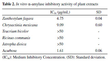 EXPERIMENTAL Materials α-Amylase from the porcine pancreas (15 U mg-1) was used instead of human amylase because of its cost and availability. Starch, acarbose, 3,5-dinitrosalicylic acid (DNS), sodium chloride, dibasic sodium phosphate, monobasic sodium phosphate, sodium, and potassium tartrate were procured from Sigma-Aldrich, USA. Sodium hydroxide was procured from CTR, México. Plant extracts Aerial parts of plants Zanthoxylum fagara, Chrysactinia mexicana, Teucrium bicolor, and Ricinus communis and roots of Jatropha dioica were used for the analysis. The extracts were prepared using different solvents: methanol for aerial parts of the plant and a mixture of ethanol and water (90:10) for roots. These plant extracts were offered by researchers from the Analytical Chemistry Department (Facultad de Medicina, UANL, México). Enzyme assay and enzyme kinetics The α-amylase activity was assessed by Miller's method by estimating the colored product formation by the action of enzyme and substrate starch (Scheme 1).9