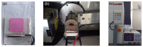 ![]() Figura 2. a) Tinta termocromática triturada e colocada no porta amostras do difratômetro de raios X, b) porta amostra montado no difratômetro contendo a amostra e c) visão externa de parte do difratômetro e do sistema para controle da temperatura