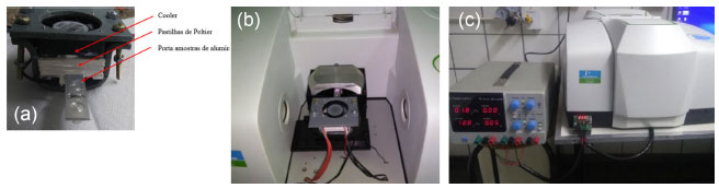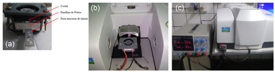 Controle de temperatura no Espectrômetro de Infravermelho (FTIR) O sistema utilizado para as medidas espectroscópicas vibracional foi realizado em um espectrômetro de infravermelho (FTIR) Perkinelmer modelo Frontier 93430, modo Reflectância Total Atenuada (ATR), o sistema foi adaptado ao porta amostra, sendo confeccionado em alumínio para melhor condução de calor. O princípio desse sistema ocorre por transferência de calor das pastilhas de Peltier. A Figura 3a representa o sistema contendo o porta amostra, pastilhas de Peltier e cooler. Figura 3b mostra o dispositivo desenvolvido acoplado ao acessório de ATR e Figura 3c visão externa no espectrômetro.