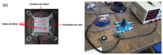 As pastilhas Peltier foram alimentadas por uma fonte de tensão modelo MPL 3303M (Minipa, São Paulo, Brasil) com a variação de tensão de 0 - 32 V e corrente máxima de 3 A. As tensões e a correntes nas pastilhas foram monitoradas empregando dois multímetros modelos ET-2028C (Minipa, São Paulo, Brasil). Outros dois multímetros semelhantes foram usados para medir as temperaturas das faces aquecida e resfriada dos dispositivos termoelétricos, as pastilhas de Peltier fixadas no suporte de acrílico e PVC, com dimensões de 170 mm / 170 mm / 120 mm, conforme ilustrado na Figura 1. A fonte de alimentação foi ajustada em 0,0 V e a tensão nas pastilhas com incrementos de 0,2 V em 0,2 V. A cada aumento de tensão registrou a temperatura da pastilha e a corrente consumida. Esse experimento teve como objetivo: relacionar a variação da temperatura com a potência consumida pela pastilha para conseguir o melhor desempenho para temperaturas mais baixas. O experimento foi repetido com duas patilhas sobrepostas (lado quente com lado frio) separados por uma pasta térmica, a ideia de se utilizar duas pastilhas de Peltier é promover uma maior diferença de temperatura entre a face que aquece a que resfria. Tintas termocromáticas Chromazone® As tintas termocromáticas utilizadas são da marca ChromaZone® da empresa TMCHallcrest - UK, as quais foram doadas por uma empresa da cidade de Franca. As estruturas químicas dos componentes não são divulgadas por se tratar de um produto comercial, as informações disponíveis descrevem que as tintas são formadas por compostos orgânicos e a mudança de cor inicia-se 4 °C abaixo da temperatura de transição. As tintas utilizadas apresentaram temperaturas de transição de 22, 25 e 31 °C. Caracterização das tintas termocromáticas Uma gota de cada tinta foi fixada sobre a pastilha de Peltier no suporte, o qual atua para garantir o isolamento térmico, as tintas com temperaturas de ativação de 22 e 25 °C foram utilizadas o lado que esfria da pastilha de Peltier e a de 31 °C o lado que aquece, as tintas permaneceram por 24 h até secarem totalmente. Em seguida, foi aplicado 1,8 V na pastilha de Peltier e o controle de temperatura realizado através da placa modelo W1209 marca Animuss (Shezhen Animuss Company Limited, Guangdong, China). A tinta com temperatura de transição de 22 °C utilizou intervalo de temperatura de 15 à 25 °C, para a de 25 oC o intervalo foi de 18 à 28 °C e para a de 31 °C a faixa de temperatura foi de 23 à 34 °C, para todas as amostras o incremento de temperatura foi de 1 em 1 °C. O registro fotográfico da mudança de coloração das tintas foi realizado após 2 min da alteração da tensão. O processo inverso foi realizado, com decréscimo da temperatura de 1 em 1 oC nos mesmos intervalos de temperaturas. Controle da temperatura no difratômetro de raios X As medidas de difração de raios X foram realizadas em um difratômetro de raios X Miniflex II da Rigaku Corporation, radiação Kα Cu, as tintas secas e trituradas foram colocadas no porta amostras do equipamento, conforme ilustrado na Figura 2a e acoplada ao difratômetro, conforme Figura 2b e a Figura 2c mostra a visão externa do sistema do equipamento com o acessório de temperatura.