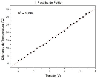Os sistemas sem o dissipador de calor apresentaram uma temperatura da face que aquece ao redor de 76 °C, e um decréscimo da temperatura da face fria, esse fato ocorre devido ao aumento da distância entre as duas faces dos sistemas montados, quanto maior a distância entre as faces, menor a temperatura da face fria da pastilha de Peltier. O sistema contendo uma pastilha de Peltier apresenta maior temperatura na face fria, isso se deve à proximidade entre as duas faces, ao adicionar duas e três pastilhas esse distanciamento reduz a temperatura da face fria. Esse sistema foi aplicado para a tinta que apresenta uma maior temperatura de transição. A montagem do sistema com o dissipador de calor promove uma redução da temperatura máxima de ambos as faces, a que aquece e a que resfria. Isso já era esperado, pois o dissipador atua na dissipação do calor não deixando que ocorra a transferência de calor entre as faces. Em todas as caracterizações das pastilhas de Peltier, quando relaciona a diferença de temperatura em função da tensão aplicada, observa-se uma linearidade nos dados, para efeito de ilustração a Figura 5 apresenta o gráfico desta relação para o sistema contendo uma pastilha de Peltier.