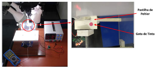 Tintas termocrômaticas Chromazone® As tintas foram caracterizadas com relação a mudança de cor em função da temperatura de transição, gotas das tintas foram colocadas sobre a pastilha de Peltier. A variação da tensão promoveu mudanças da temperatura, a qual foi acompanhada através de registro fotográfico, o sistema utilizado é mostrado na Figura 6.