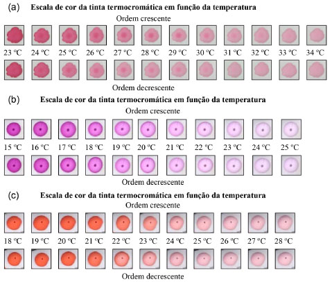 As Figuras 7a, 7b e 7c mostram as fotografias das gotas das tintas utilizada neste trabalho em função da temperatura com incremento de 1 °C no intervalo de temperatura da mudança de cor, conforme relatado pelo fabricante.