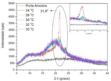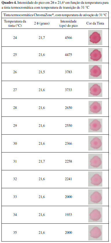 As medidas foram obtidas em tempo real sem alteração da posição da amostra e do porta amostra, portanto, é factível a comparação das intensidade nos difratogramas. O pico em 2θ; = 21,6o apresentou-se intenso para a temperatura de 24 °C, o mesmo pico começa a decrescer de intensidade com o aumento da temperatura, até desaparecer totalmente nas temperaturas acima de 31 °C. O pico pode ser atribuído ao estearato de metila composto em fase monoclínica (ICDD PDF nº 00-032-1764), esse composto é frequentemente utilizado como solvente que define a transição da temperatura em pigmentos termocrômicos.13 As análises foram realizadas sem necessidade de abrir a tampa do equipamento, pois foi possível alterar a temperatura do experimento através da placa de controle de temperatura fixado no suporte na parte externa do difratômetro de raios X (Figura 2). O Quadro 4 apresenta a intensidade do pico em 2θ; = 21,6o em função da temperatura.