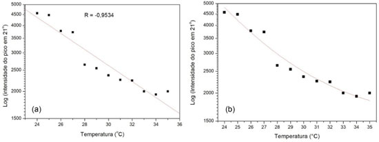 As Figuras 9a e 9b mostram o ajuste matemático (linearidade e exponencial) para a intensidade do pico em função da temperatura.