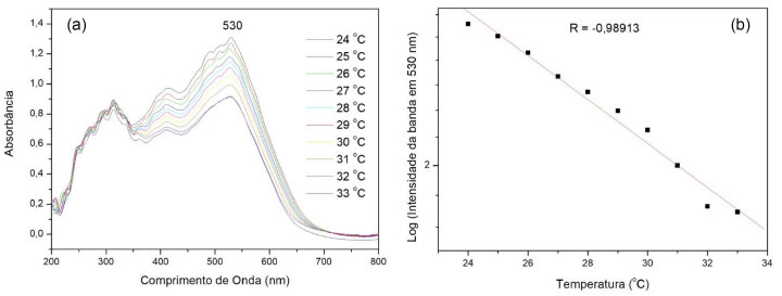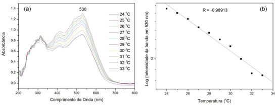 ![]() Figura 10. a) Espectros de absorbância da tinta com temperatura de transição de 31 oC e b) ajuste linear da banda em 530 nm, em função da temperatura